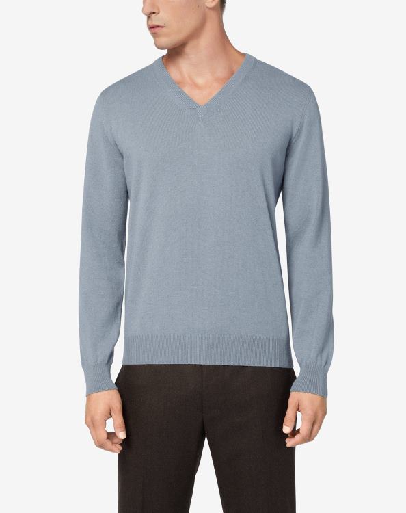 ισορροπημένα σχήματα και όγκοι χαρακτηρίζουν το στυλ της συλλογής corneliani. για τη χειμερινή κολεξιόν του φθινοπώρου, η μάρκα προσφέρει ένα πουλόβερ με λαιμόκοψη σε στάχτη μπλε απόχρωση σε εξαιρετικό κασμίρ. ένα ρούχο υψηλής ποιότητας ιταλικής κατασκευής που συνδυάζει την αριστεία και την κομψότητα.