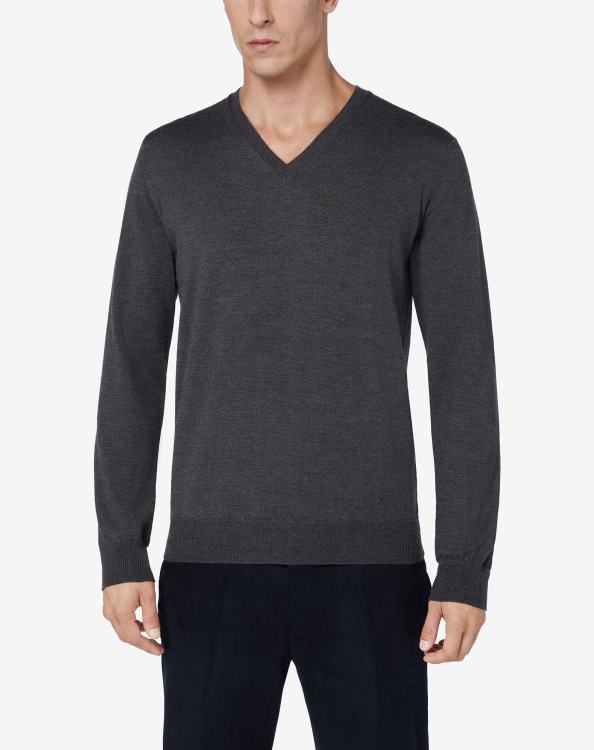 ισορροπημένα σχήματα και όγκοι χαρακτηρίζουν το στυλ της συλλογής corneliani. για τη χειμερινή κολεξιόν του φθινοπώρου, η μάρκα προτείνει ένα ευέλικτο και άνετο ρούχο με λαιμόκοψη σε σκούρο γκρι μελανζ από καθαρό μαλλί μερινό, ιδανικό για μια εκλεπτυσμένη αλλά και καθημερινή εμφάνιση.