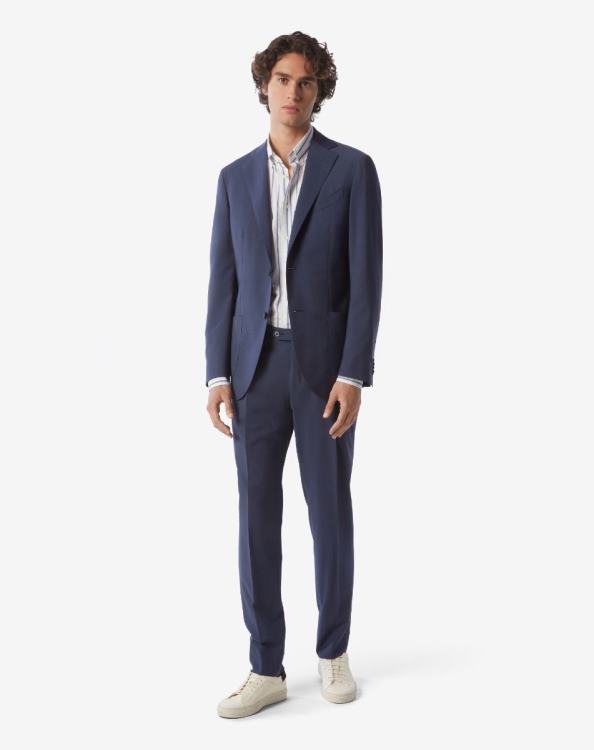 η ανδρική φόρμα δύο τεμαχίων από παρθένο μαλλί s120s από τη γραμμή πύλης έχει κλασική εφαρμογή και πλαϊνά σκισίματα στο πίσω μέρος για ευκολία στην κίνηση. Το τροπικό ύφασμα με την παχιά πλέξη του κάνει το ρούχο αέρινο και ελαφρύ, με μια στεγνή και φρέσκια πινελιά, ιδανικό για τον ζεστό καιρό. η ποιότητα s120 του μαλλιού εγγυάται ένα εξαιρετικά λεπτό και επανειλημμένα κλωσμένο νήμα: το ύφασμα είναι επομένως πιο ελαφρύ και πιο ανθεκτικό.