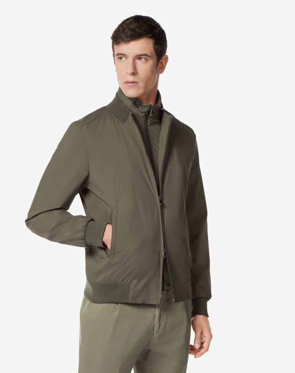 το ανδρικό μπουφάν με κουκούλα από τεχνικό ύφασμα είναι ένα ρούχο με αθλητική ψυχή πολλαπλών χρήσεων χάρη στην αποσπώμενη νάιλον σαλιάρα που του επιτρέπει να χρησιμοποιείται σε διαφορετικές καταστάσεις. Τα πλεκτά ένθετα με ραβδώσεις στο στρίφωμα και στις μανσέτες είναι μια λεπτομέρεια σχεδιασμένη για να μεγιστοποιεί την άνεση και τη σπορ απόδοση του ενδύματος.