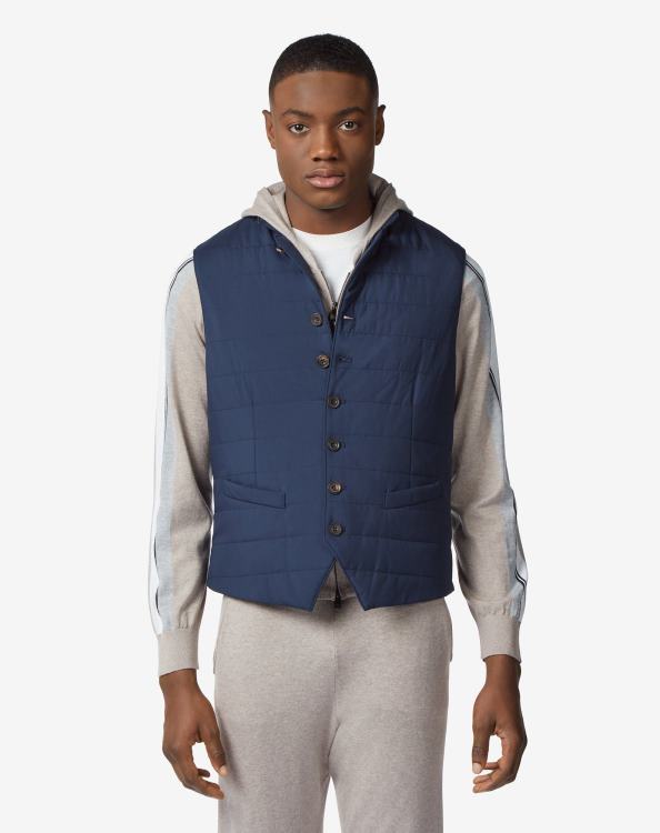 το ανδρικό γιλέκο με καπιτονέ με επένδυση είναι ένα εμβληματικό ανοιξιάτικο ρούχο. Η corneliani προτείνει ένα κλασικό στιλ με οριζόντια επένδυση και βάτα αλλά σε ένα αδιάβροχο, εξαιρετικά ελαφρύ τεχνικό ύφασμα. το μπροστινό κούμπωμα με κουμπί απαλύνει τη σπορ διάθεση του ενδύματος με μια κομψή πινελιά. για να φορεθεί στην πόλη ή σε εξωτερικούς χώρους για ένα εκλεπτυσμένο, σπορ στυλ.